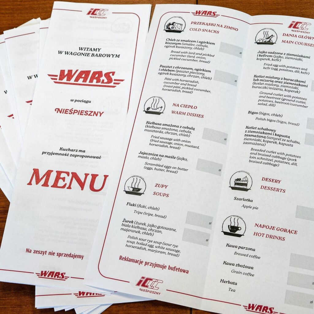 Atmosferę dawnych przejazdów dopełni wagon barowy typu 113A z obsługą WARS. W menu znajdą się dania inspirowane klasyczną kuchnią polską oraz napoje przywołujące smak podróży z minionych dekad.